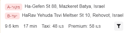 - מיד עם סיום הקלדת היעד הסדרן מקבל את המסלול המצויר במפה, המרחק, משך הזמן והמחיר לשני סוגי רכבים: רגיל ופרימיום